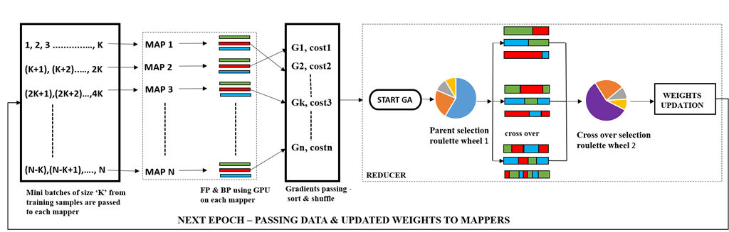 - Once the new weights are passed to the reducer, the weights are updated using the modified GA.